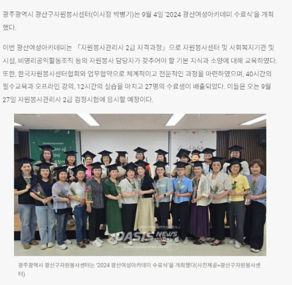 [오아시스뉴스]광산구자원봉사센터, 2024년 광산여성아카데미 자원봉사관리사2급 자격과정 수료식 성료