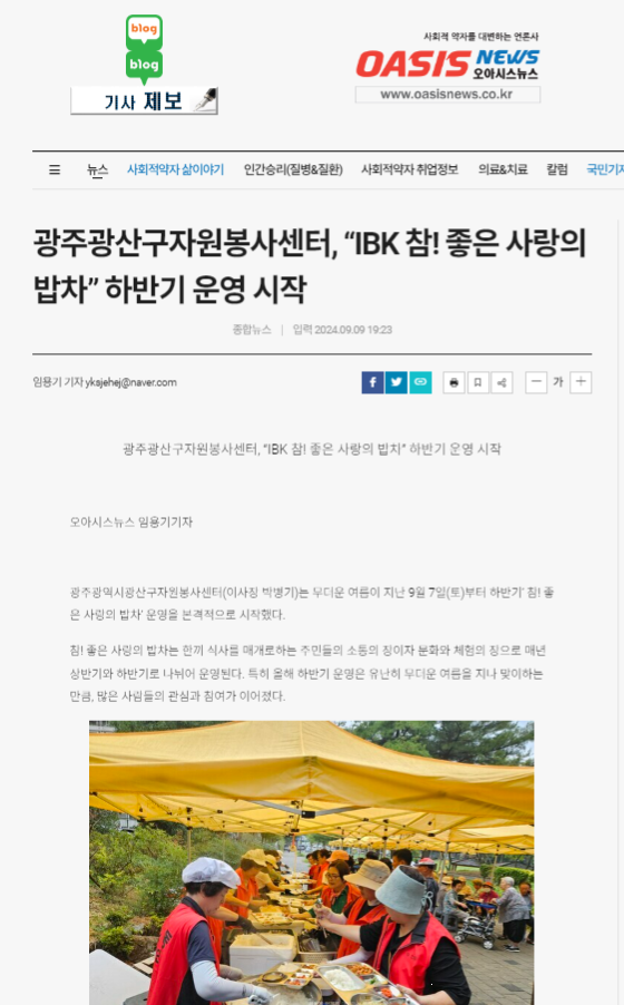 광주광역시광산구자원봉사센터(이사장 박병기)는 무더운 여름이 지난 9월 7일(토)부터 하반기‘ 참! 좋은 사랑의 밥차’ 운영을 본격적으로 시작했다.