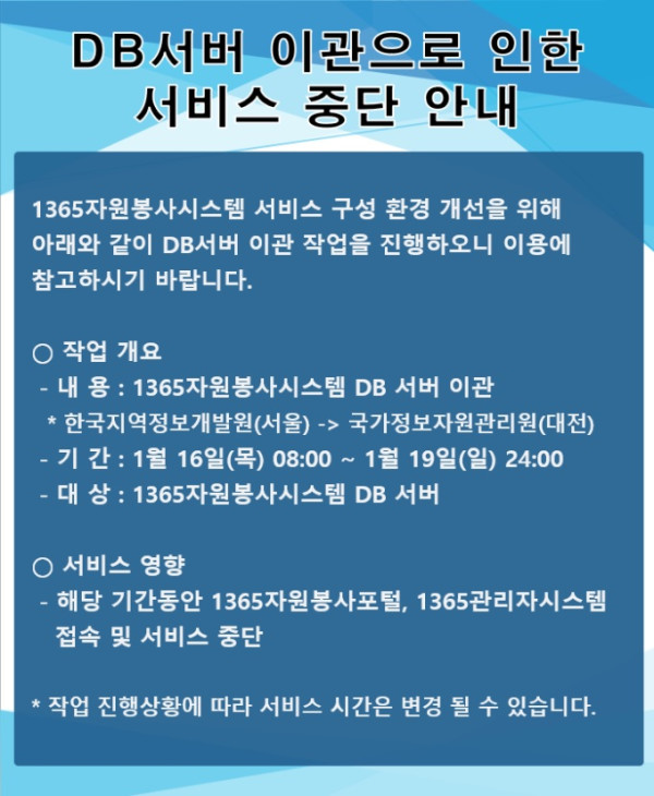 - 해당 기간동안 1365자원봉사포털, 1365관리자시스템 접속 및 서비스 중단