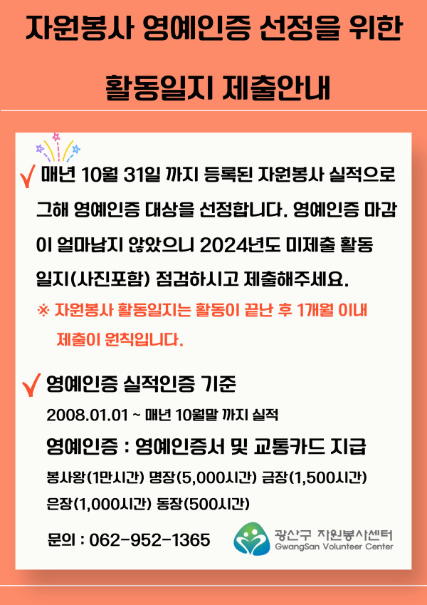자원봉사 영예인증 선정을 위한 활동일지 제출안내