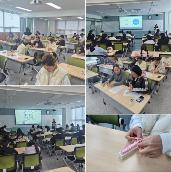 교육이 끝난 후에는 자원봉사 활동 체험으로 파라코드키링 만들기를 진행하였습니다. 파라코드는 군사용 낙하산 줄을 재활용한 소재로, 자원의 순환을 실천할 수 있는 친환경 키링입니다. 1인 2개씩 키링을 만들어 하나는 직접 사용하고, 하나는 나누며 따뜻한 마음을 전하는 기쁨을 경험했습니다.