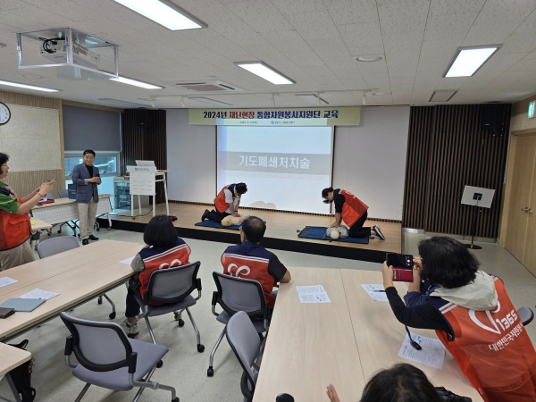 재난발생 대비 단계, 현장배치, 자원봉사자의 자세, 사례 등 체계적인 교육과 함께 심폐소생술,